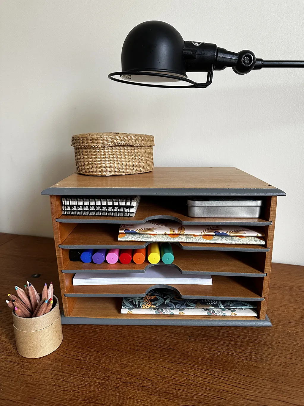 Pratique, compact et parfait pour mettre de l’ordre en beauté sur un bureau ou dans un espace de travail. Plus d’excuses, pour ne pas ranger avec ce joli petit meuble !